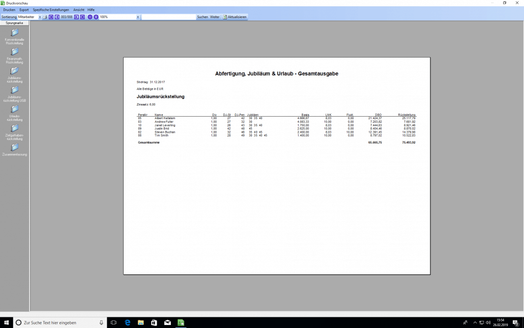 Die Software dient zur Berechnung der unternehmens- und steuerrechtlichen Bilanzrückstellungen für Abfertigungen, für Jubiläen, nicht konsumierte Urlaube und Zeitguthaben zu einem bestimmten Stichtag.