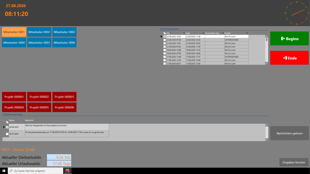 Die Zeiten können via Zeiterfassungsterminal oder auch Online (auch am Handy) erfasst werden.